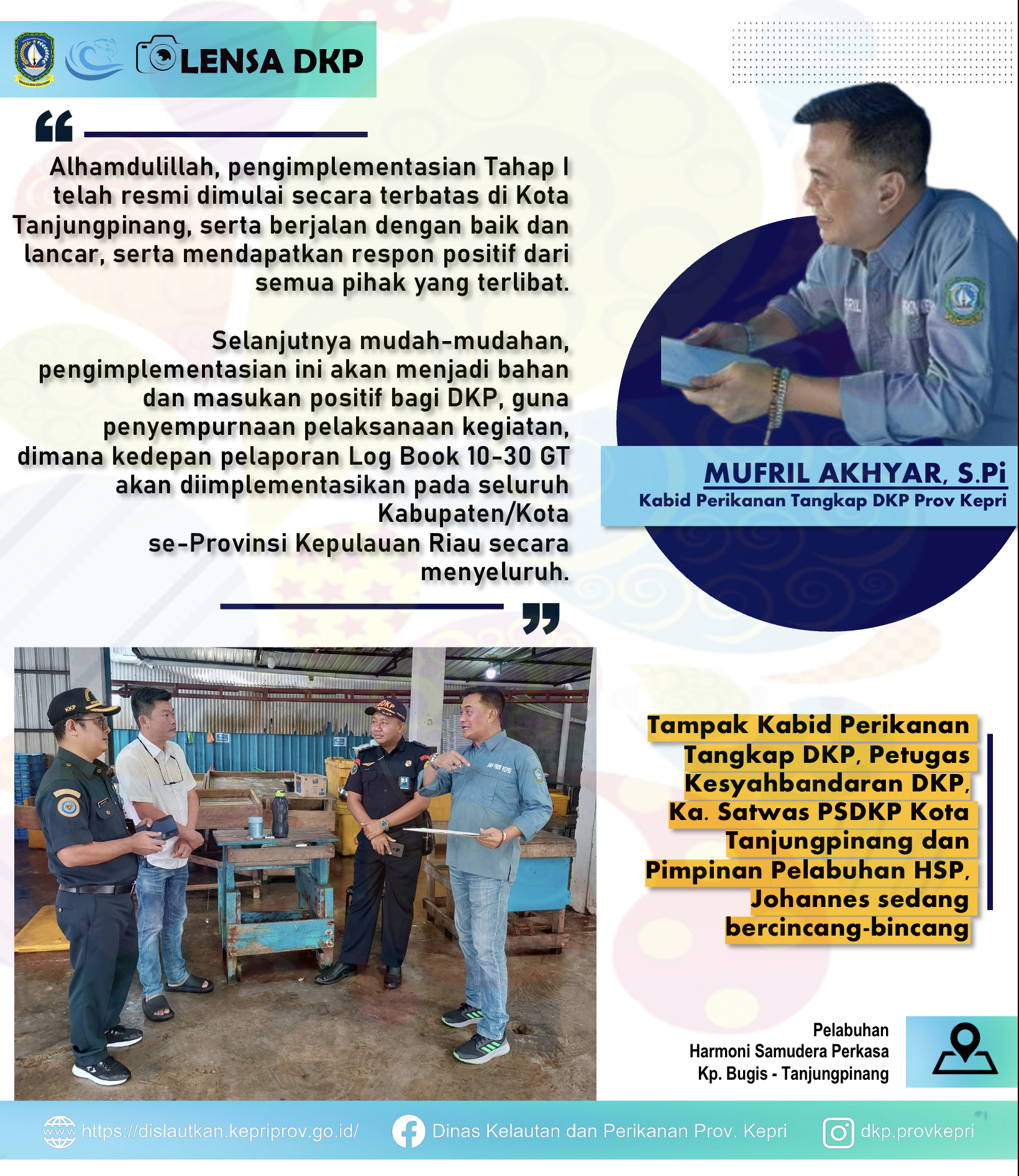 Kegiatan Pendataan Penangkapan Ikan Terukur bagi Nakhoda/Nelayan Kapal Penangkapan Ikan 10-30 GT melalui Pelaporan Log Book di Provinsi Kepulauan Riau Tahap I, secara resmi mulai diimplementasikan pada wilayah Kota Tanjungpinang, Selasa 1 Agustus 2023, bertempat di Pelabuhan Harmoni Samudera Perkasa, Kp. Bugis Kec. Tanjungpinang Kota - Kota Tanjungpinang.